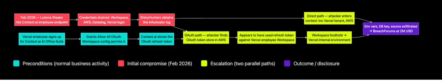 A Vercel employee signed up for a consumer AI productivity tool using their corporate Google Workspace account and granted it broad OAuth scopes. The vendor behind that tool, Context.ai, was breached. The stored OAuth grant became the attacker's path back into the employee's corporate identity and from there into Vercel's internal environment.